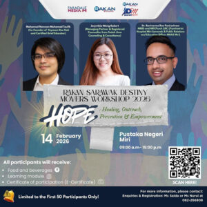 Miri, Sarawak – 14 February 2026 – Faradale Media-M successfully organised the RAKAN Sarawak Destiny Movers (RSDM) Mental Health Workshop: HOPE (Healing, Outreach, Prevention, Empowerment) at Pustaka Negeri Sarawak Miri from 9:00 a.m. to 4:00 p.m., bringing together mental health professionals, advocates, and members of the public for a day of meaningful dialogue and community engagement.